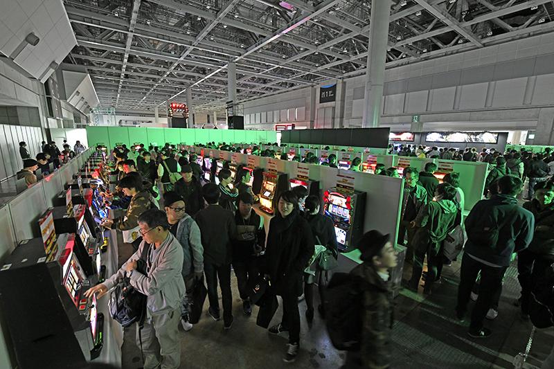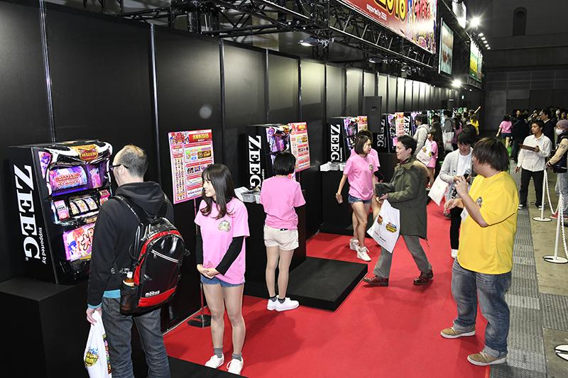パチスロ試打コーナーでは新旧の名機を打ちたいというファンのために、2社で計200台以上を設置した。