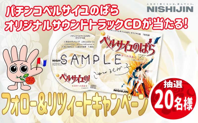 「西陣 弐式ツイッター(てっちゃん)」のアカウントをフォローして、キャンペーンツイートをリツイートすると、抽選で20人にオリジナルCDが当たる。同CDには、パチンコベルサイユのばらシリーズで使用された7曲が収録されている。