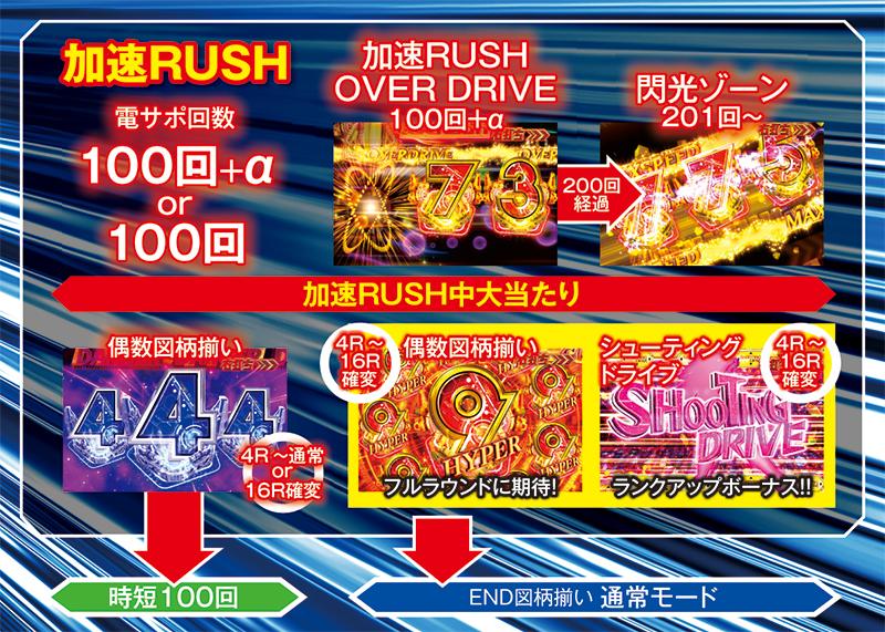 確変「加速RUSH」中、最初の100+α回転は「加速RUSH OVER DRIVE」のゾーン。奇数揃いならば4R~16R確変で、全ラウンドの可能性があるランクアップボーナス「シューティングドライブ」も搭載した。