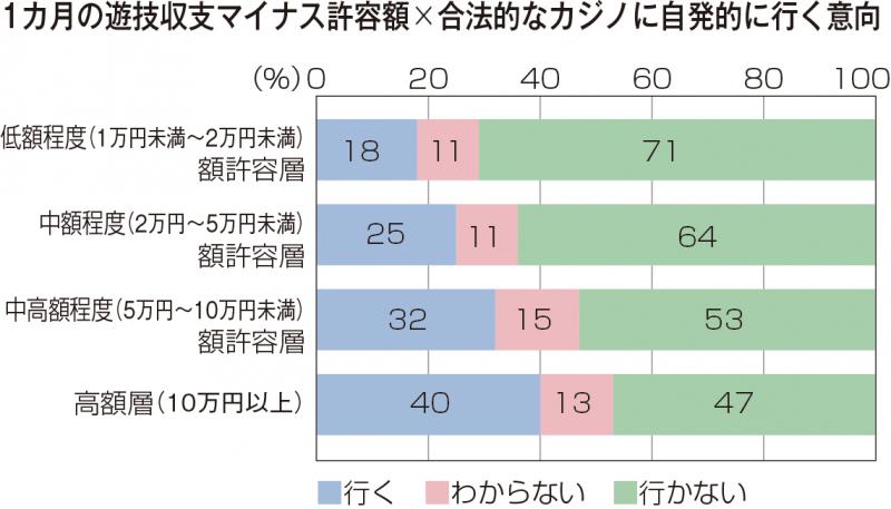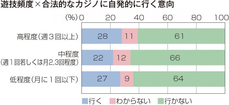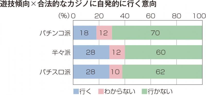 その結果、「行く」と答えたのは24%(行く7%、たぶん行く17%)だった。現在よく遊技している種目別でプレイヤーを分けると、パチスロ派(パチスロのみ、主にパチスロを遊技)、半々派(パチンコ・パチスロ同程度)がパチンコ派(パチンコのみ、主にパチンコを遊技)よりも「行く」と答えた割合が10ポイント高かった。年齢が低いほど、カジノ参加意向が高い傾向があり、パチスロ派の平均年齢がパチンコ派より低いことが関係しているかもしれない。