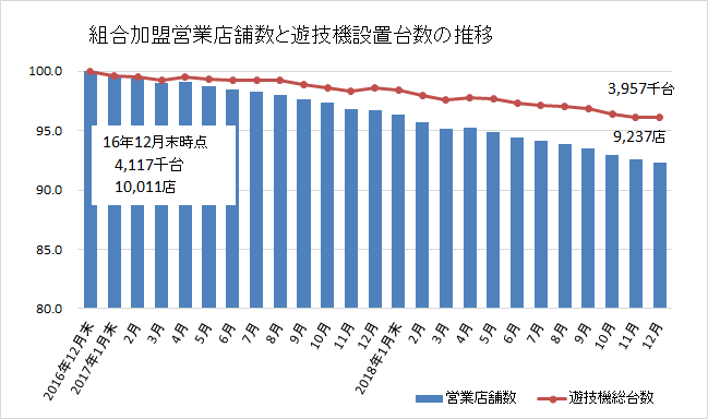 2017年12月末時点からの12カ月間に、営業店舗数は444店(4.6%)減少、ぱちんこ遊技機は8万2301台(3.3%)減少、回胴式遊技機は2万1116台(1.4%)減少、総台数は10万3417台(2.5%)減少した。店舗数の減少率に比べ、設置台数の減少率が小さいことからも、店舗の大型化傾向が読み取れる。また、ぱちんこ遊技機と回胴式遊技機の設置比率は61.2対38.8で、過去12カ月でほとんど変化はない。