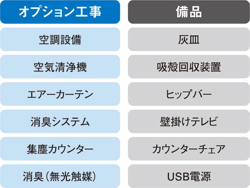 喫煙室『Fパッケージ』は、選べる4サイズの喫煙室にいろいろとカスタマイズできるオプションをセットにしたパッケージ製品だ。基本工事である間仕切り、給気口、換気口、換気設備などの施工に加えて、空気清浄機、消臭システム、エアーカーテン、分煙機などのオプションを豊富に揃えている。