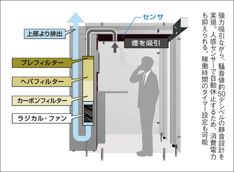 基本的な標準仕様は3タイプ。4人までの同時利用を想定したオープン型、6人までのセミオープン型およびドア型だ。いずれも入口部からブース内に流れる気流の速度は、毎秒0.2メートル以上。浮遊粉塵濃度は0.15ミリグラム/立方メートル以下だ。備え付けの吸殻入れは約3500本を収納。喫煙ブースを連結させて、規模に応じた運用もできる。
