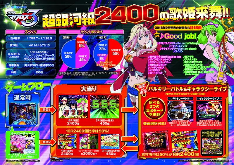 『フィーバーマクロスフロンティア』シリーズの3作目がいよいよ登場。最大払い出し2400個という旧規則機ならではの出玉感も魅力のひとつだ。