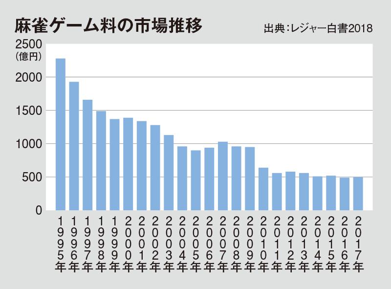 一方で麻雀ゲームを提供する雀荘は、厳しい経営環境が続く。17年の市場規模は過去最低水準の500億円。参加人口は前年比横ばいの500万人で、店舗数は同4・8%減の8736軒だった。市場規模は過去10年で半減、最盛期の4分の1以下だ。1人で遊技できるパチンコ・パチスロに比べて、集客の障壁も高い。