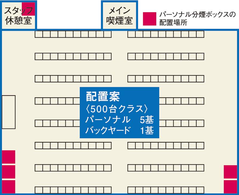 駅前型の狭小ホールはもちろん、喫煙ボックスの設置スペースを比較的確保しやすい郊外型大型店舗にも『パーソナル分煙ボックス』はおすすめだ。メインの大型喫煙室がすでにある店舗でも、遊技コーナーとの隣接設置・分散設置・遠隔設置など、さまざまな活用次第で、離席率を減らし稼働低下抑止に貢献する。