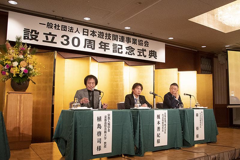 式典第二部では、「遊技文化考 ~産業の本質から未来へのアプローチ~」と題したパネルディスカッションが行われた。パネラーは宗教人類学者で京都造形芸術大学の植島啓司教授、京楽産業.の榎本善紀社長、マルハンの韓裕社長。