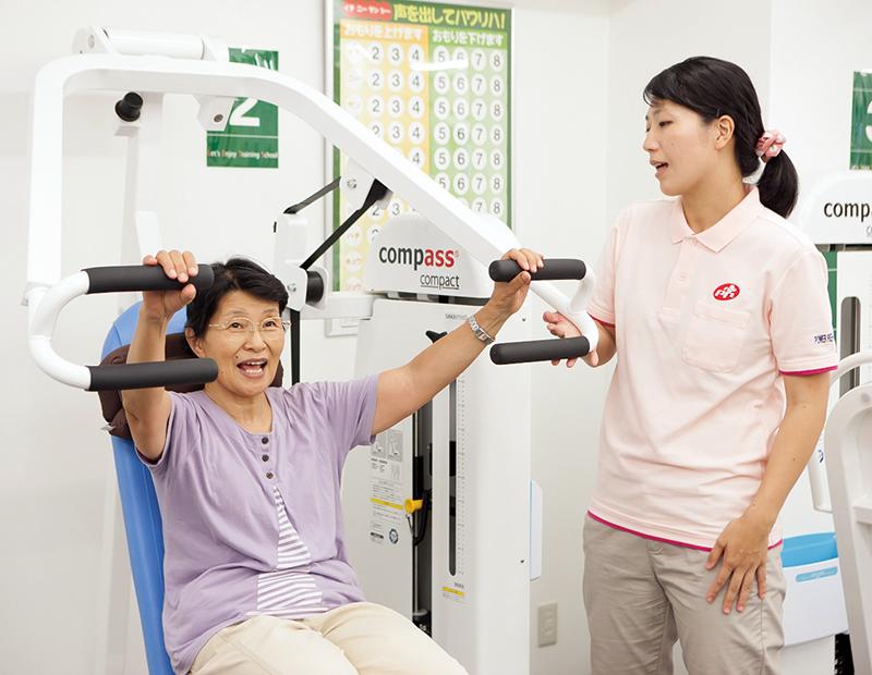 機能訓練は筋肉を鍛えるのではなく、老化によって使われなくなった不活動筋や神経を刺激するもの。リハビリマシンを使ったトレーニングプログラムを提供することで、「立つ」「座る」「歩く」「着替える」などの日常生活に必要な動作の機能回復をサポートする。施設内はフイットネスクラブのような明るい雰囲気で、利用者がはつらつと身体を動かしているのが印象的だ。