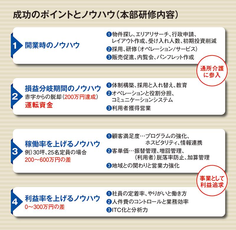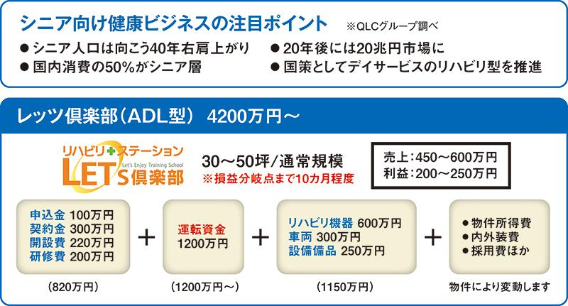 QLCグループは、リハビリに特化した半日型デイサービス「LET’S倶楽部」と、日常生活動作訓練型の1日型デイサービス「ブリッジライフ」を展開している。わずか8年で直営・FC合わせて140店舗までに成長。評価される理由は、開業前・後の万全なサポート体制にあるという。