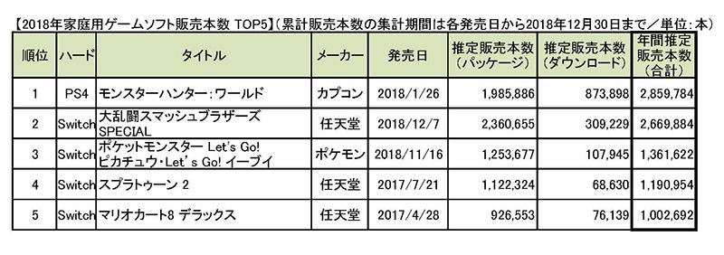 一方、パッケージソフト(店頭や通信販売)とオンライン決済(ダウンロード販売、サブスクリプション、追加課金など)で構成されるソフト市場は、2年連続で前年を上回った。販売本数トップは286万本を販売した「モンスターハンター:ワールド」(カプコン、PS4)。他タイトルがパッケージ販売主流の中、ダウンロード販売本数が3割以上を占めた。