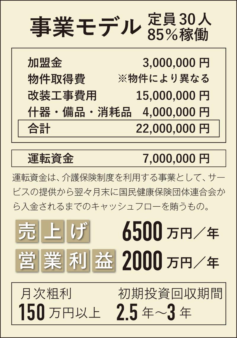 定員30人・85%稼働のビジネスモデルのイニシャルコストは上の表の通り。このほか、ロイヤリティが1カ月10万円かかる。立地条件にもよるが、売上げは安定期で年間約6500万円、営業利益約2000万円を想定。直営施設(岐阜県可児市)の場合6人で運営、施設長以外はすべてパートスタッフと、人件費抑制の実現、安定経営の一因となっている。