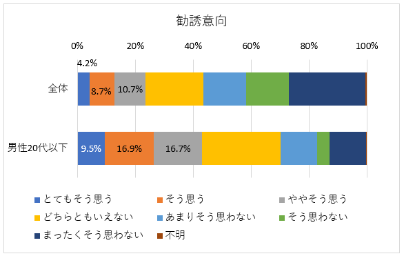 誰かを誘って遊技に行きたいと思う人は全体で12・9%(「とてもそう思う」と「そう思う」の合計値)、「ややそう思う」を合わせると23・6%だった。勧誘意向が高いのは男女いずれも20代以下。一方、男性50代、男性40代の勧誘意向は他の層より相対的に低い。