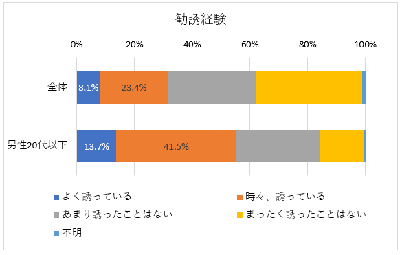 実際に「よく誘っている」というプレイヤーは全体では8・1%。性・年代別に見ると、男性20代以下が13・7%で他の層に比べ顕著に多い。