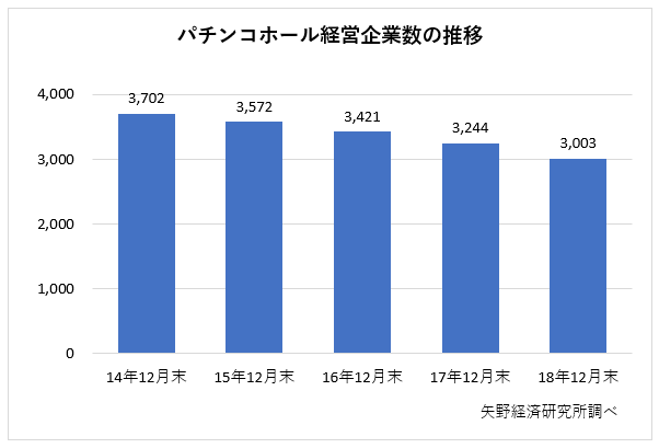 18年12月時点のパチンコホール経営企業数は3003社で、前の年より241社減少。経営企業数は13年以降、年間100社以上のペースで減少している。