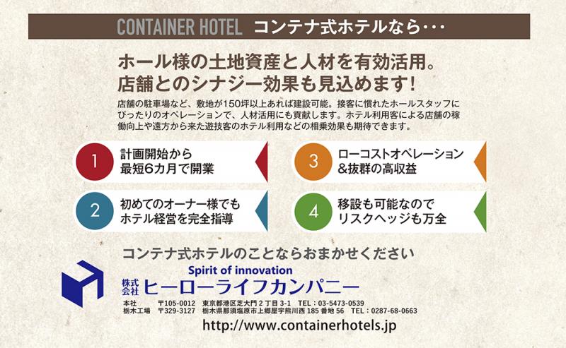 ヒーローライフカンパニーは最近、あるホール法人に既存店舗併用型のコンテナ式ホテルを提案した。インバウンド需要も見込めるエリアで、店舗の広大な駐車場を有効活用するプランだ。遊技機を毎月入れ替えれば年間数千万円から億単位の経費がかかるが、ホテルは頻繁に設備を更新する必要がないという話に、このホール法人の責任者は大きな関心を示したという。