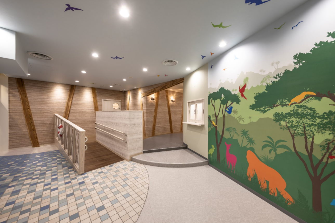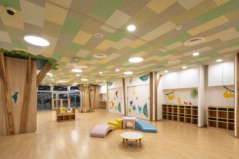 そらもり保育園は、セガブルー=空、サミーグリーン=森をイメージして名付けられた。セガの森(長野県南佐久郡)のカラマツ材を内装に使用するなど、子どもたちがのびのびと過ごすことができるよう森をイメージした環境を演出している。