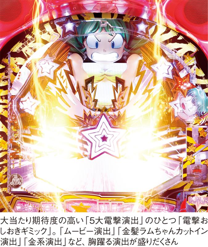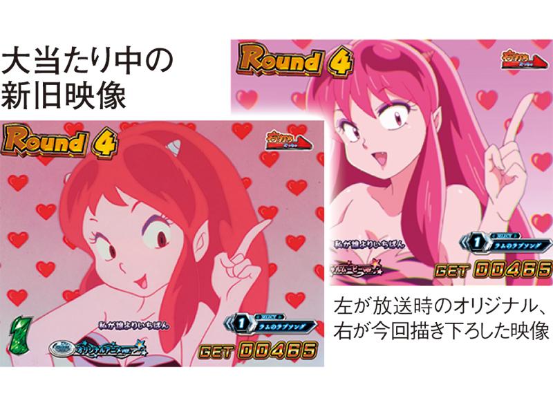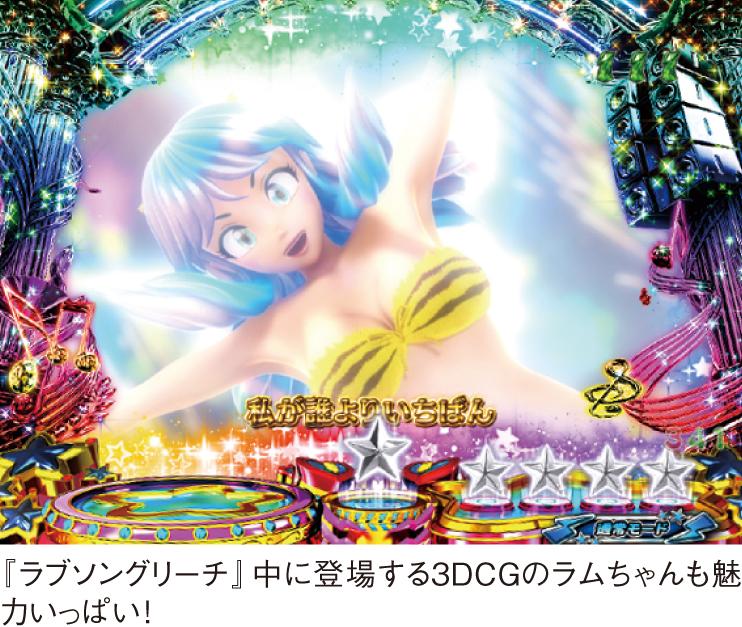 テレビアニメのオープニングテーマ『ラムのラブソング』が遊技機に搭載されるのは業界初。大当たり中はもちろん、期待度激高の『ラブソングリーチ』でも聴くことができ、3DCGのラムがこの曲に合わせて躍る姿は胸熱ものだ。CV陣も豪華で、ラム役の平野文や諸星あたる役の古川登志夫など、テレビアニメ版の主要な声優を登用した。