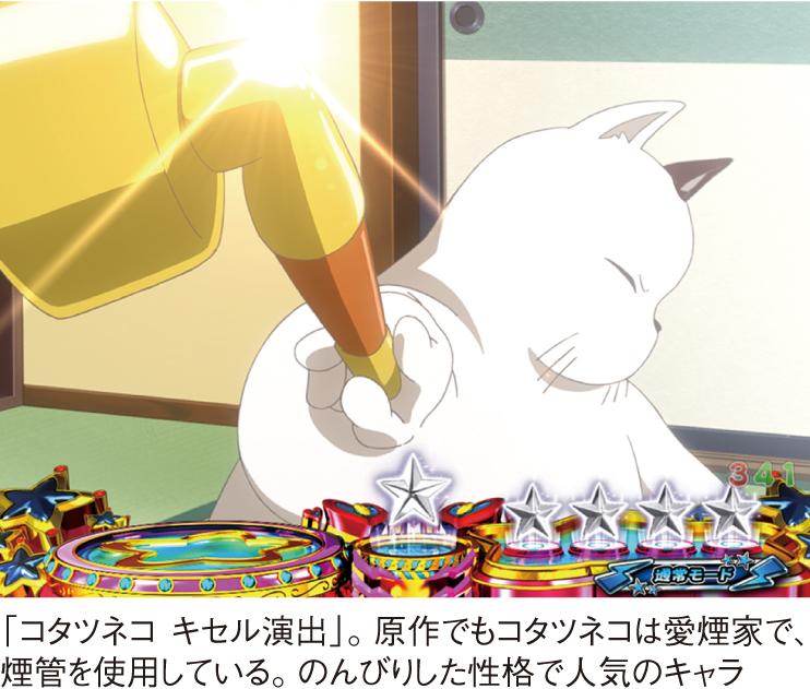 期待度の高い演出のひとつが「コタツネコ キセル演出」だ。リーチ直後に発生、扉からコタツネコが登場し、キセルを煙草盆に打ちつければ……。『花の慶次』シリーズのセルフパロディだが、ビッグコンテンツ同士でこんなことができるのも、ニューギンならではだ。