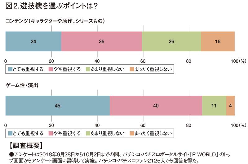図2は本紙が行ったアンケートだ。遊技機を選ぶ際コンテンツを「とても重視する」「やや重視する」というファンは約60%。ゲーム性や演出を「とても重視する」「やや重視する」と答えたファンは、85%を超える。