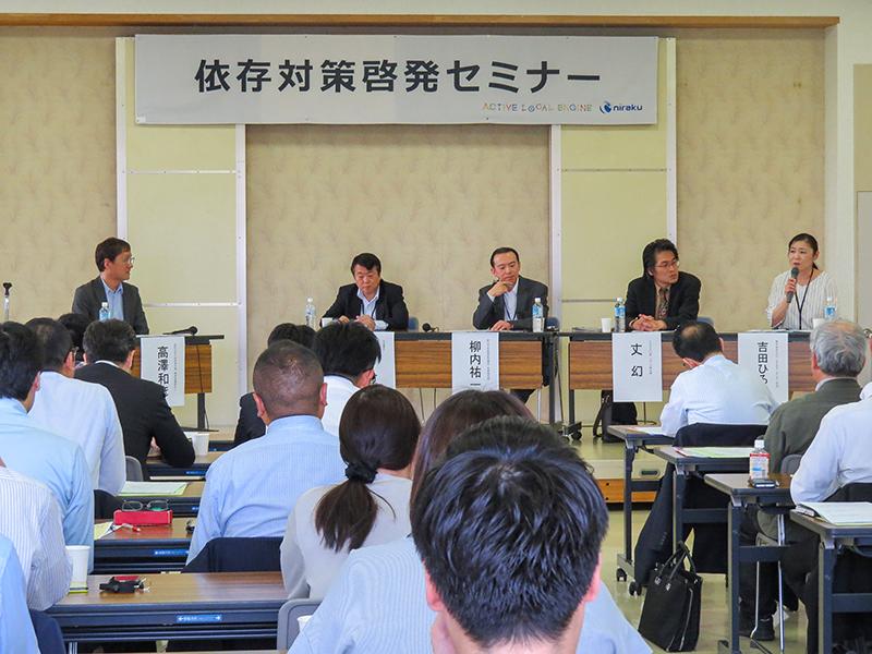 第二部の討論会では、高澤代表のほか、司法書士の稲村厚氏、郡山市社会福祉協議会の柳内祐一氏、パチンコ研究科の丈幻氏、ニラク法務部カスタマーセンターの吉田ひろみ氏がパネリストとして登壇。さまざまな立場から依存対策の在り方を検討した。