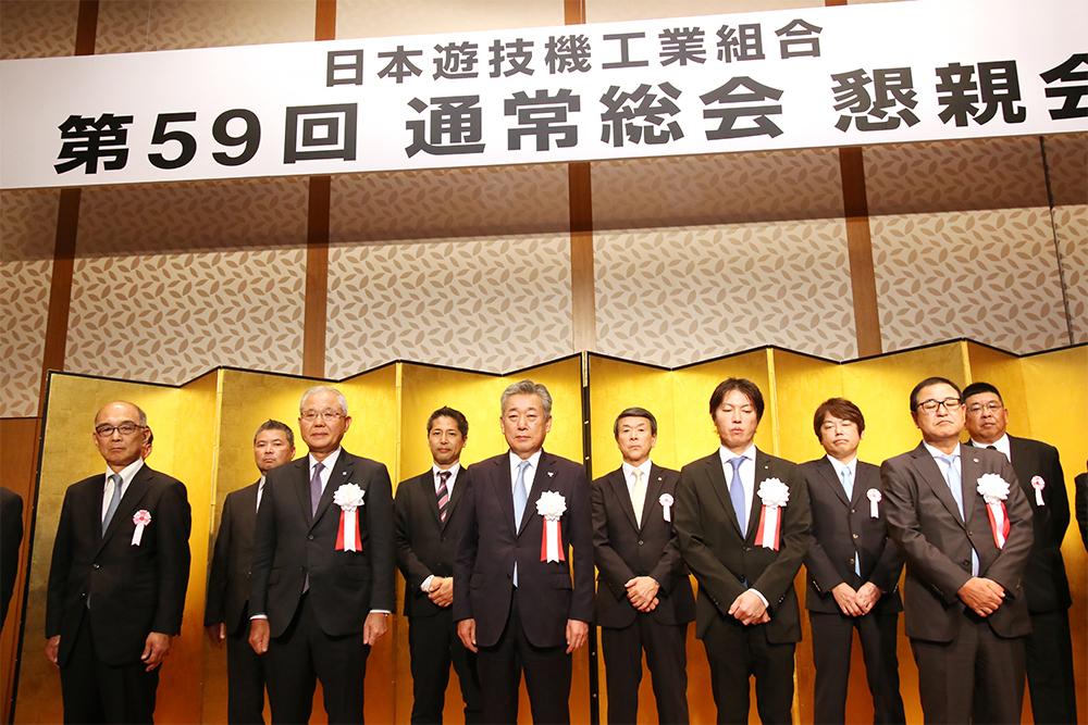 総会後の懇親会で挨拶に立った筒井理事長は「規則改正に伴う入替に関しては、製造業者として新規則に対応した遊技機の市場への提供がまだまだ十分ではない状況。一刻も早くファンのみなさまに安心して遊んでいただける遊技機を提供し、入替の需要に対応できるよう総力を挙げていく」と決意を示した。