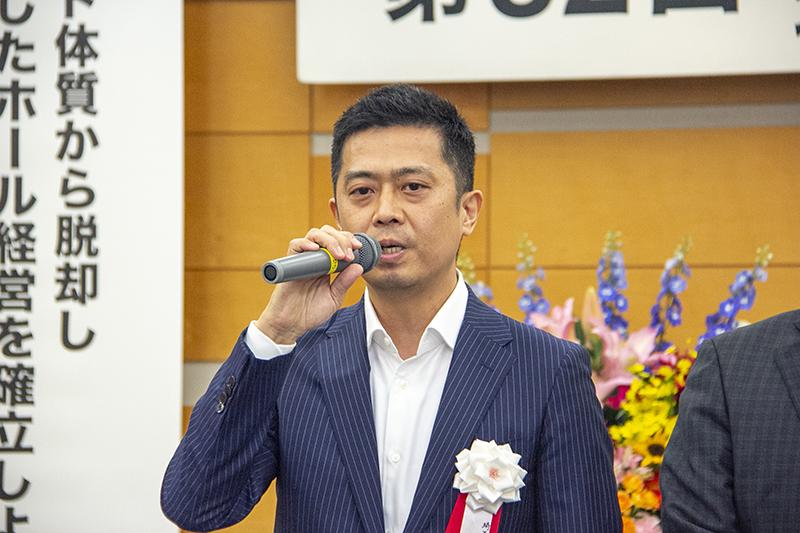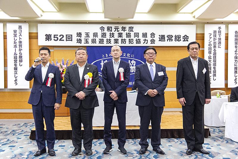 2019年06月10日No.10001224 埼玉県遊協新理事長に趙顕洙氏 執行部理事。左から趙理事長、根岸英人副理事長、五月女善重副理事長、密山祥赫副理事長、紙屋修三専務理事 埼玉県遊技業協同組合は6月7日、さいたま市内で通常総会を開催。任期満了に伴う役員改選で、新理事長に趙顕洙氏を選出した。理事長を12期24年務めた山田茂則氏は、常任顧問に就いた。 趙理事長は就任挨拶で「若輩の身で重責をひしひしと感じている。みなさまのご指導・ご協力を賜わりながらその声に耳を傾けて、手となり足となり、フットワークの軽い組合運営、防犯協力会の活動にまい進したい」と決意を表明した。 趙理事長 祝賀会では山田前理事長に花束の贈呈が行われた
