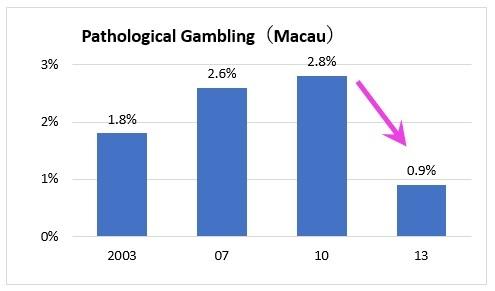 マカオでは、アメリカ精神医学会によるDSM4基準で「病理学的賭博」(Pathological Gambling=持続的で反復的な不適応的賭博行為。10項目中5項目以上に該当)の疑いがある人の割合は、2003年調査では1.8%、07年調査では2.6%、10年調査では2.8%と市場の拡大とともに増加したが、13年調査では0.9%と減少に転じた。