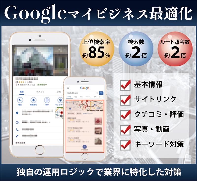 Googleマイビジネスは現在、Googleが積極的に推奨するサービスの一つ。Googleブラウザの利用者はGoogleマイビジネスの店舗情報を見て店選びをする傾向にあり、早急な対策が求められている。ジーズでは、パチンコ業界に特化したGoogleマイビジネスの最適化サービスを基本情報の整備に加えて、クチコミ・レビュー・掲載写真の管理までを対応。また、キーワード対策によりエリアの上位3枠に表示させるなど、確かな実績で支持を集めている。