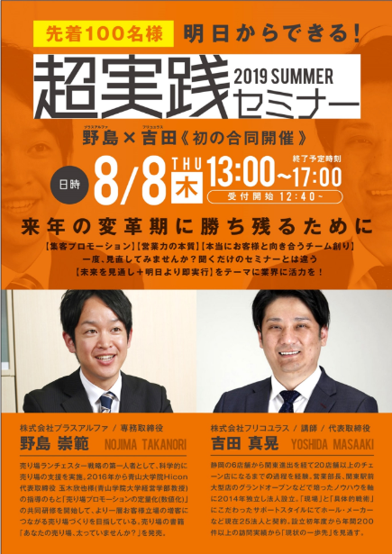 ホール向け営業コンサルティングや研修を行うフリコユラス(東京都)は8月8日に、東京・秋葉原でプラスアルファ(東京都)と合同でセミナーを開催する。「超実践セミナー2019SUMMER」と題したセミナーは、来年の変革期に勝ち残るために、「集客プロモーション」「営業力の本質」「本当にお客様と向き合うチーム創り」を見直すことを提言する。