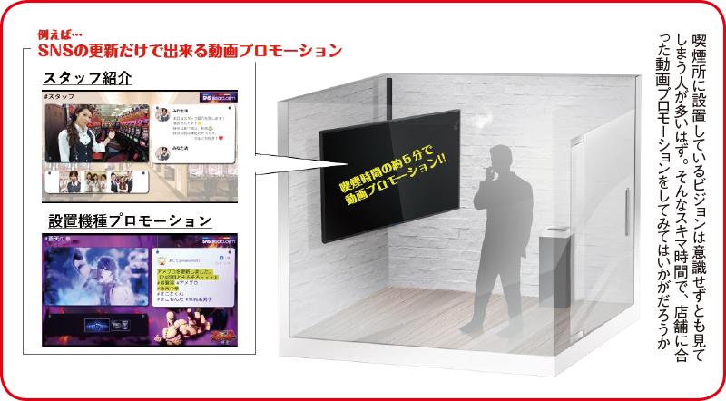 「店内の喫煙ブースほど、立ち止まってモニターを見てもらえる空間はない。喫煙時間は約1分。その限られた時間の中でファンに訴求するなら、15秒ほどの動画が効果的。例えば、スタッフ紹介をすれば日常会話のキッカケづくりになる。新機種のプロモーション動画であれば遊技意欲が湧きます」(道地本部長)