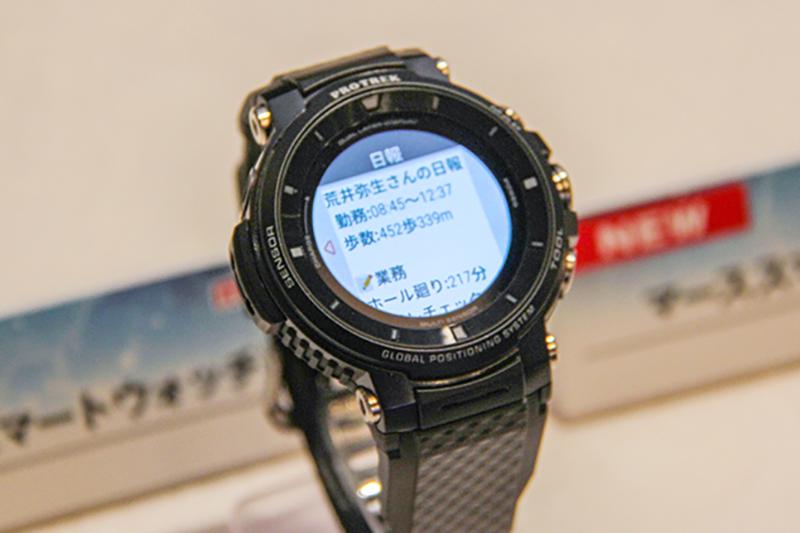 二つ目の新製品は、スタッフの業務負担軽減と作業効率向上を実現する腕時計型ウェアラブル端末『スマートウォッチⅡ』だ。後述する新製品『セルフ交換対応POS』と連動した通知を行うほか、顔認証システムと連動した来店客の顔画像を表示(参考出品)。画面の見やすさや操作性を高めるために、カシオ製のハードを採用した。