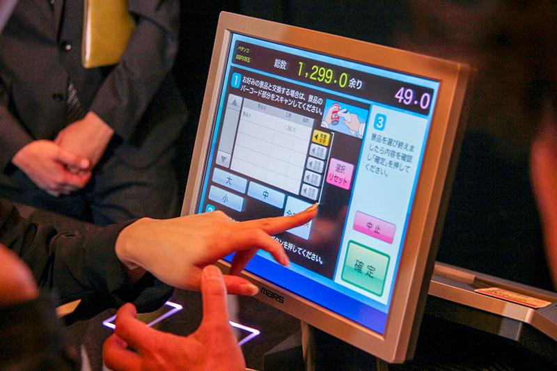 三つ目の新製品は、遊技客が自分で景品交換を行える『セルフ交換対応POS』だ。遊技客はタッチパネル液晶で年齢認証を行ってから、レシートや会員カードをPOSに読み込ませ、4円パチンコや20円パチスロなど交換する口座を選択する。非会員であれば外付けのプリンターが印字する端玉分を、バイキング形式の景品コーナーから持ち帰る。交換後のワンデーカードは専用回収箱に投入して完結だ。会員専用機としても運用できる。