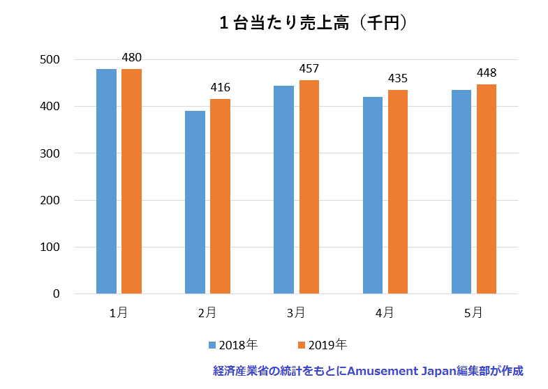 サービス産業の売上高等の経営動向を把握するために、経済産業省が毎月実施している「特定サービス産業動態統計調査」によると、5月度の遊技機1台当たりの月間売上高は前年同月より1万1800円(2.7%)増加し44万7900円。4カ月連続して前年同月を上回った。