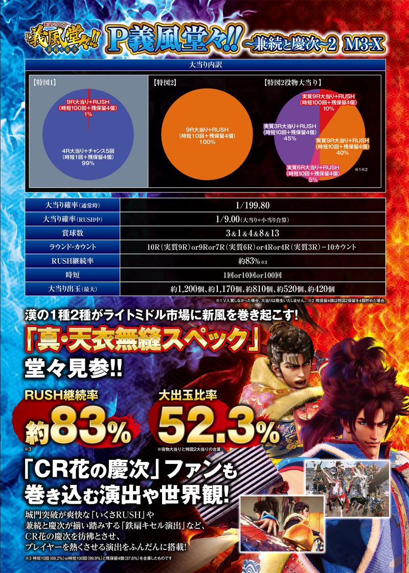 新機種『P義風堂々!!~兼続と慶次~2 M3-X』は、漫画家・原哲夫氏の同名漫画とのタイアップ。前田慶次の莫逆の友である、直江兼続を主役に「花の慶次」では描き切れなかった兼続の半生を追う。作中には慶次も登場し、花慶ファンには堪らない戦国大河だ。
