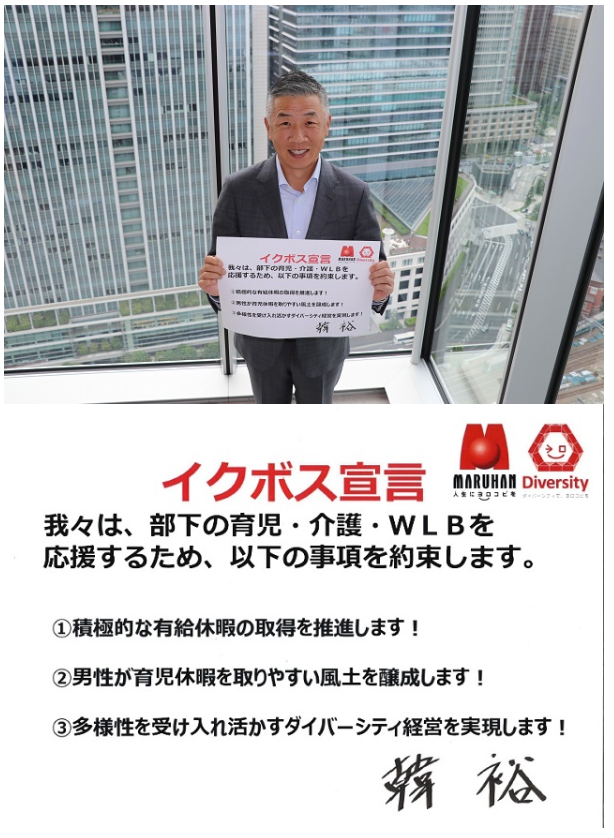 イクボスとは、部下や同僚等の育児や介護・ワークライフバランス等に配慮・理解のある上司のことで、「イクボス宣言」とは組織のトップや幹部がイクボスを目指すことを宣言すること。厚生労働省がこれを広げるキャンペーンを展開しており、マルハンでは韓裕社長がイクボス宣言を表明、その宣言が厚生労働省のサイトに登録された。