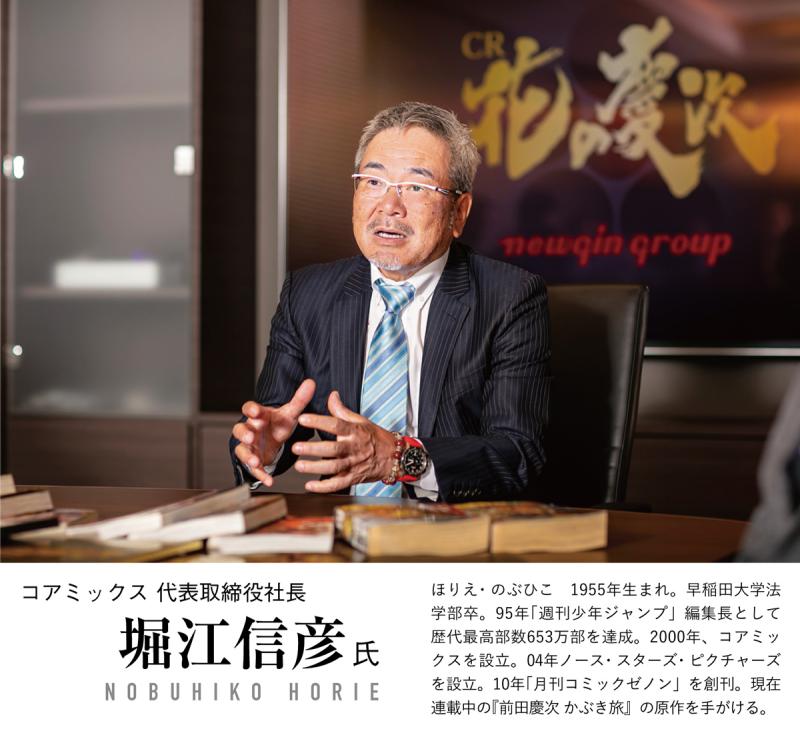 シリーズ第一作となる『CR花の慶次‐雲のかなたに‐』が登場して12年。『花の慶次』の世界観は漫画やパチンコ、イベント、社会貢献活動などを通して多くの人たちに親しまれている。『花の慶次』というコンテンツとともに長年歩んできたニューギン販売の笹本教光専務と、コアミックスの堀江信彦社長に、「花慶が創造する文化」をテーマに語り合っていただいた。