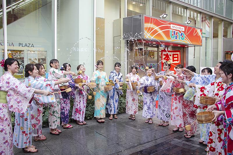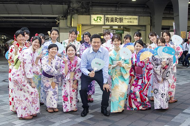 色とりどりの浴衣に身を包んだ女性スタッフ15人は、声を掛け合いながら手にした桶とひしゃくで打ち水。江戸時代からの知恵である日本らしい風物詩を実演した。有楽町エリアを行き交う人々は足を止めて写真を撮ったり、ひと時の涼を楽しんでいた。