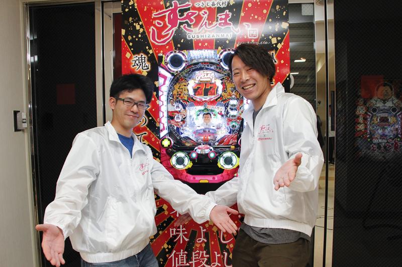 本機は有名すしチェーン店「すしざんまい」との異業種コラボ。大当たり確率は1/35・2の役物タイプであることから、じっくり打ち込んでもらうために試打時間を1時間取った。
