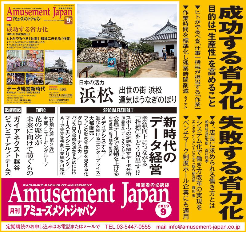 月刊アミューズメントジャパン2019年9月号の第2特集は「データ活用」をテーマに、異業種の事例やホール営業で活用できる機器を紹介している。