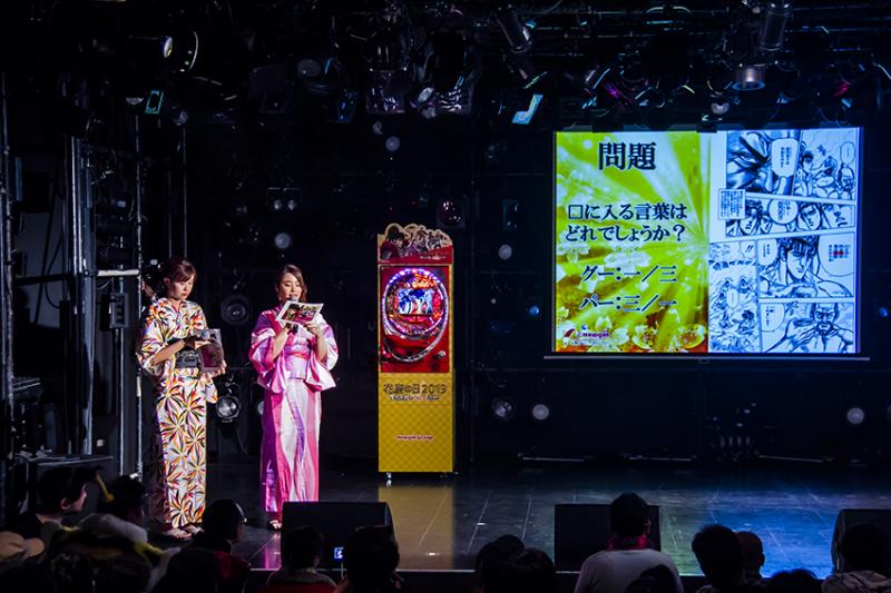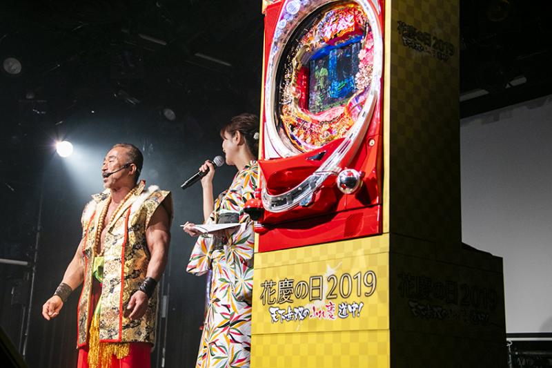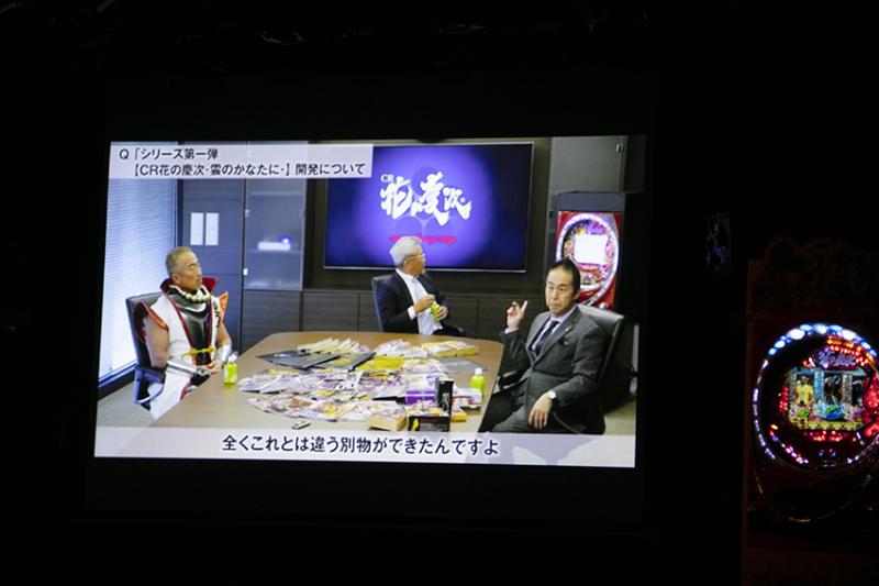 再び登場した青山さんとかしめさん、そして木りんさんの3人のトークでは、ステージに2台置かれた初代の『CR花の慶次-雲のかなたに』の話題に移ったところで、コアミックスの堀江信彦社長と角田信朗さん、ニューギン販売の笹本教光専務の3人がマンガとパチンコの「花の慶次」誕生秘話を語り合う映像が紹介された。このパチンコ史に残る名機の挿入歌がご存じ「傾奇者恋歌」。ここで角田信朗さんが登場して同曲を歌い上げた。