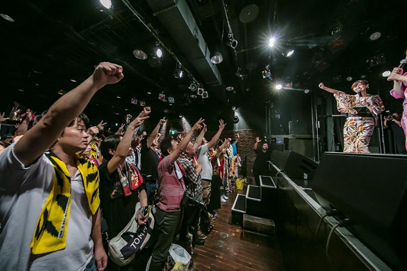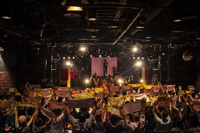 会場となったのは広島市内の繁華街、新世界にある「広島CLUB QUATTRO」。広島における音楽シーンのメッカに熱い花慶ファン400人が集まった。広島会場からは「朱槍」も登場。入り口付近に飾られた朱槍の前での撮影会にも花が咲いた。