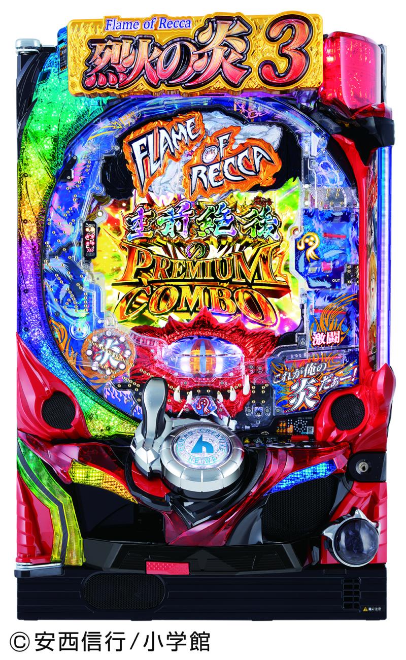 『P烈火の炎3』は、大当たり確率1/313.5のV確バトルスペックだ。初当たり時に50%の振り分けで「空前絶後のPREMIUM COMBO」に当選。約1500個を払い出す10R確変「極烈火BONUS」と期待出玉約1500個を誇る小当たりラッシュ「夢幻BONUS」に突入する。初当たりから約3000個の出玉に期待ができる仕様だ。