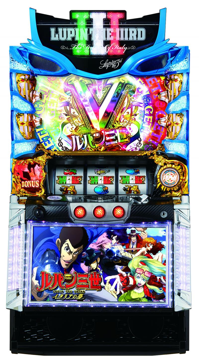 『Sルパン三世 イタリアの夢』は、“現行機最速”を誇る純増9.0枚/GのAT機だ。出玉のメインとなる疑似ボーナスは、LUPIN THE THIRD図柄or青7図柄揃いで約306枚獲得の「MAX BONUS」と15枚役ナビが5回発生する「LUPIN BONUS」の2種類。「MAX BONUS」の1G連で出玉を獲得するノンストップATだ。