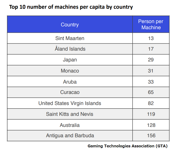 オーストラリアに本拠を置く非営利業界団体Gaming Technologies Association (GTA)の最新の推計によると、2018年に合法的に設置され稼働している世界中のゲーミングマシンの総台数は740・2万台で、約6割が日本に設置されている。