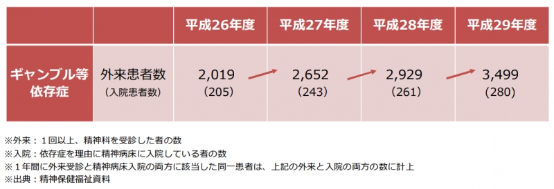 中医協の総会で提示された資料によるとギャンブル等依存症の外来患者数、入院患者数は2014年度以降増え続けており、2017年度の外来患者は2014年比73・3%増の3499人、このうち69・9%が継続外来患者。2017年度の入院患者は2014年比で36・6%増加し280人だった。