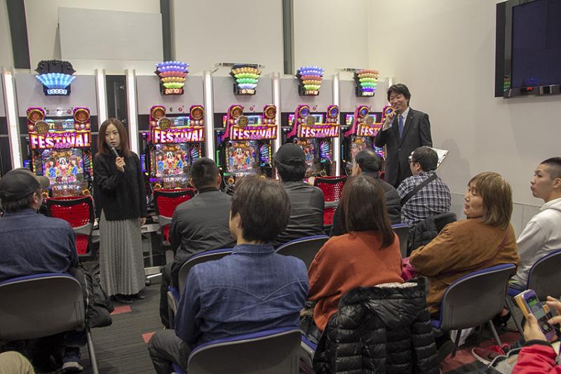 11月30日の16時からは、札幌、東京、大阪、福岡の4会場でファンミーティングを開催。東京会場には事前応制で当選した24人がイベントに参加し、パチンコ必勝ガイドの人気ライター、かおりっきぃ☆さんと、KYORAKU広報の長谷川祐也さんが新機種の指南役を務めた。