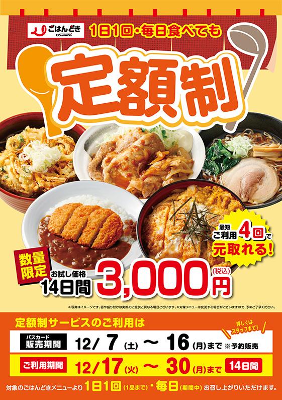 関西での開始が告知されたのは12月2日。大阪府の「ごはんどき寝屋川店」と「ごはんどき高槻店」で、14日間3000円という設定で、12月17日から30日の期間限定。毎日利用した場合、1食あたり215円となる。