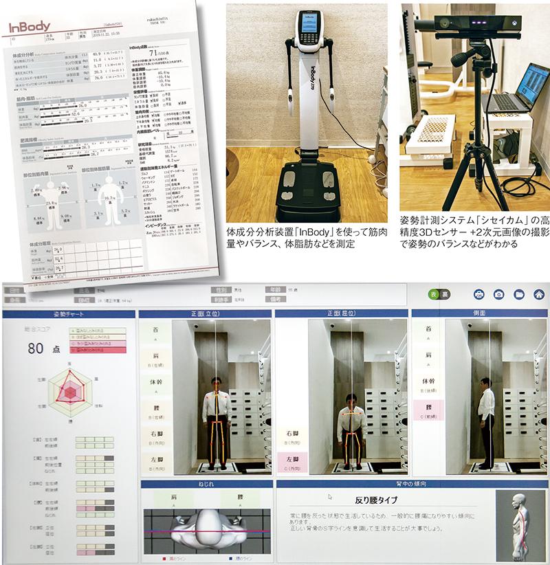 入会するとまず、体成分分析装置を使って体重、筋肉量、体脂肪量などを測定。姿勢測定システムを使ってカラダのゆがみを解析。カラダを「見える化」してその人に合ったトレーニングメニューをカルテとして提供する。