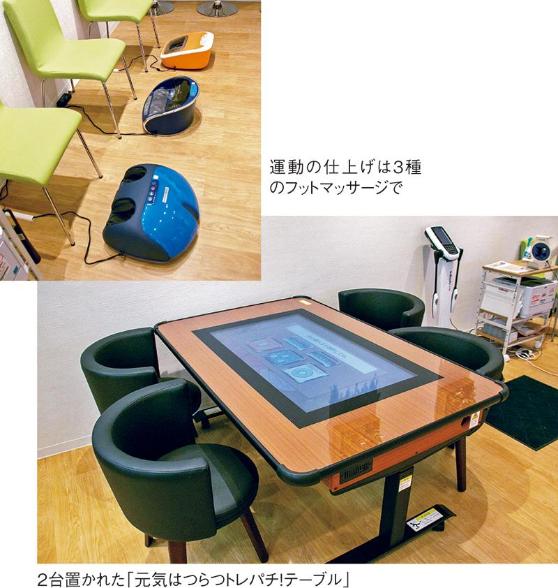 そして最後に再び血圧測定。運動後は血管が広がっているので血圧が下がる傾向にあるという。これだけのメニューをこなすと1時間から1時間半はあっという間。休憩コーナーには「元気はつらつトレパチ!テーブル」が2台設置されており、会員同士やスタッフを交えて遊んで帰る利用者もいるという。