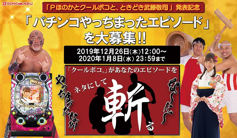 豊丸産業は2019年12月26日~2020年1月8日までの間、1月20日から全国導入される新機種『Pほのかとクールポコと、ときどき武藤敬司』の発表を記念して、パチンコファンから「パチンコやっちまったエピソード」を募集している。